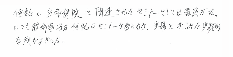 信託と生命保険を関連させたセミナーとしては最高だった。いつも教科書的な信託のセミナーが多いなか、実務とからめた実践的な所がよかった。