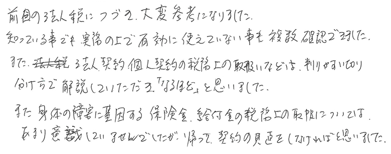 前回の法人税につづき、大変参考になりました。知っている事でも、実務の上で有効に使えていない事も複数確認できました。また、法人契約、個人契約の税務上の取扱いなどは、判りやすい切り分け方で解説していただき、「なるほど」と思いました。また、身体の障害に基因する保険金、給付金の税務上の取扱については、あまり意識していませんでしたが、帰って契約の見直をしなければと思いました。