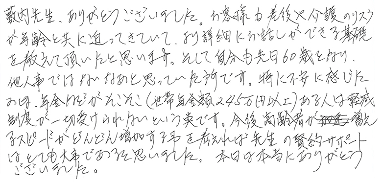 藪内先生、ありがとうございました。お客様も老後や介護のリスクが年齢と共に迫ってきていて、より詳細にお話しができる基礎を教えて頂いたと思います。そして自分も先日60歳となり、他人事ではないあぁと思っていた所です。特に不安に感じたのは、年金などがそこそこ(世帯年金額245万円以上)ある人は軽減制度が一切受けられないという点です。今後高齢者が増えるスピードがどんどん増加する事を考えれば、先生の賢約サポートはとても大事であると思いました。本日は本当にありがとうございました。