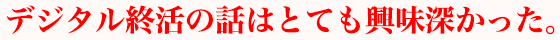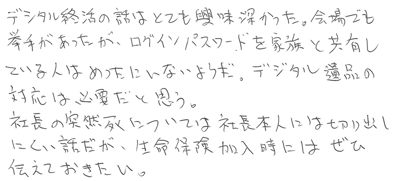 デジタル終活の話はとても興味深かった。会場でも挙手があったが、ログインパスワードを家族と共有している人はめったにいないようだ。デジタル遺品の対応は必要だと思う。社長の突然死については、社長本人には切り出しにくい話だが、生命保険加入時にはぜひ伝えておきたい。
