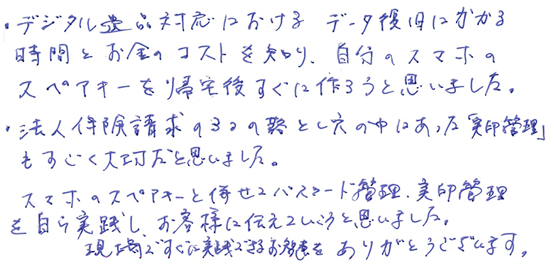 デジタル遺品対応におけるデータ復旧にかかる時間とお金のコストを知り、自分のスマホのスペアキーを帰宅後すぐに作ろうと思いました。法人保険請求の3つの落とし穴の中にあった「実印管理」もすごく大切だと思いました。スマホのスペアキーと併せてパスワード管理、実印管理を自ら実践し、お客様に伝えていこうと思いました。現場ですぐに実践できるお知恵をありがとうございます。